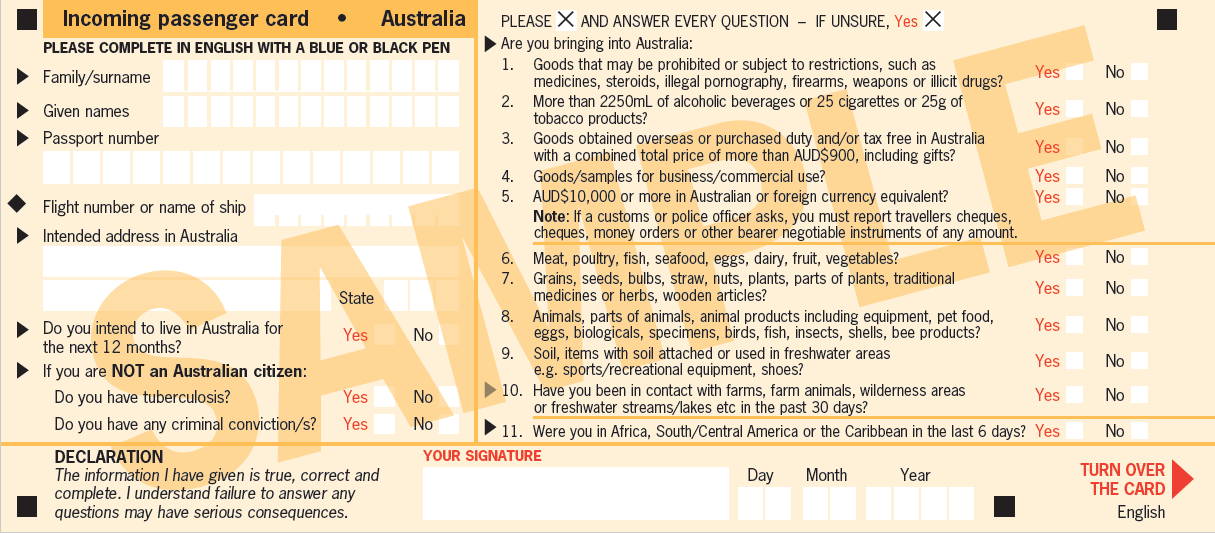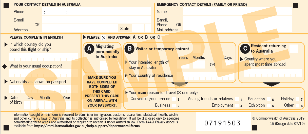 - کارت ورود مسافر (IPC): تمامی مسافران غیرشهروند باید این کارت را تکمیل کنند. این کارت باید هنگام ورود به استرالیا به افسران گمرک ارائه شود تا وضعیت مهاجرتی، اقلام همراه و اطلاعات مهم دیگر را ثبت کنند.